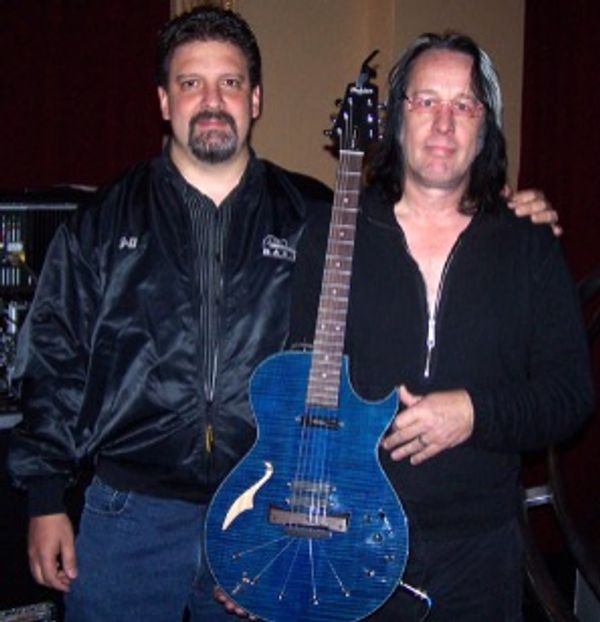 Right, Jeff Babicz presents a brand new Babicz Octane six-string electric guitar to Todd Rundgren